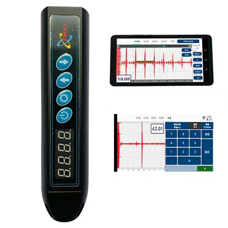 筆式電磁超聲測厚儀是一款超小型、無需聲耦合劑、非接觸式厚度測量的儀器,可實現(xiàn)金屬或?qū)Т判晕镔|(zhì)的厚度測量。